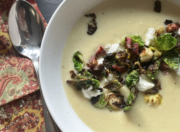 4. Sprinkle the pancetta/Brussels sprouts mixture over top of the soup, dotting with crème fraiche.